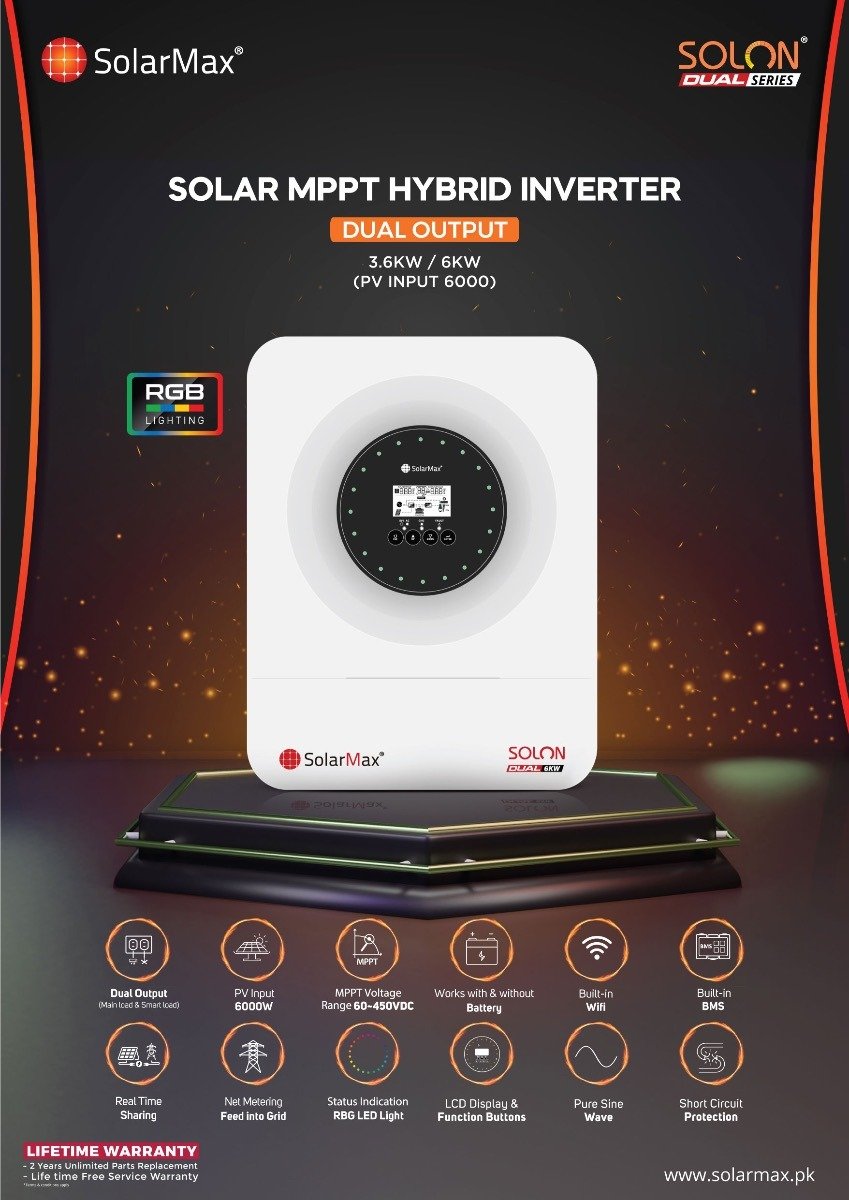SolarMax Solon Dual Series 3.6KW Hybrid Inverters with Grid Feeding Features Works with & Without 24V Battery. MPPT PV input 6KW (6000watt) and 3.6KW (3600watt) Dual Ac output for Normal Load & Heavy Load with Builtin Wifi for Remote Monitoring,RGB Lights for Status Indication and many more unique Features.